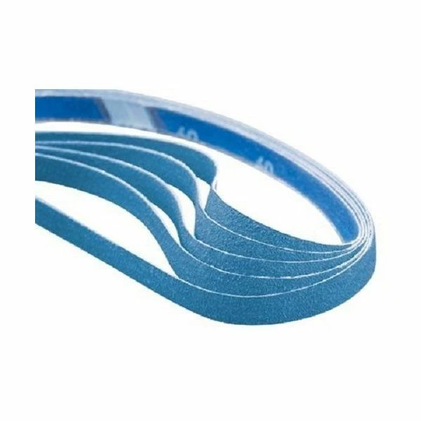 This is a 5 pack of Norton Blue fire 3/8 In wide x 13 In long sanding belts for mini belt sanders